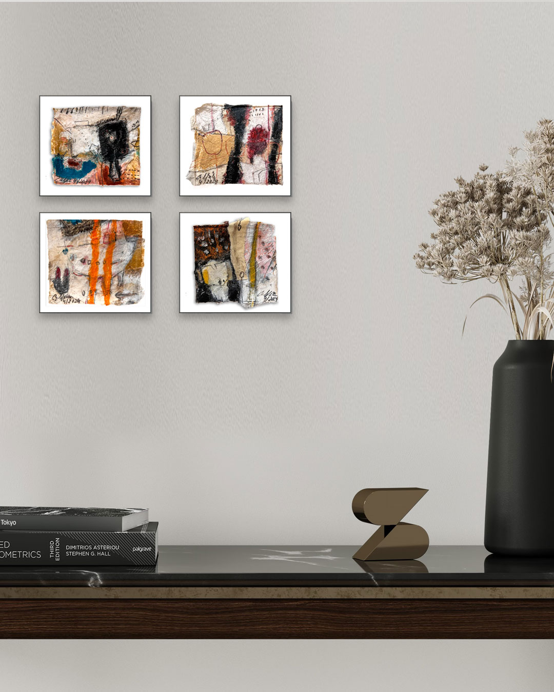 Set aus vier Zeichnungen in Mixed Media Technik im Miniformat von jeweils etwa 7 – 8 cm Breite und Höhe: